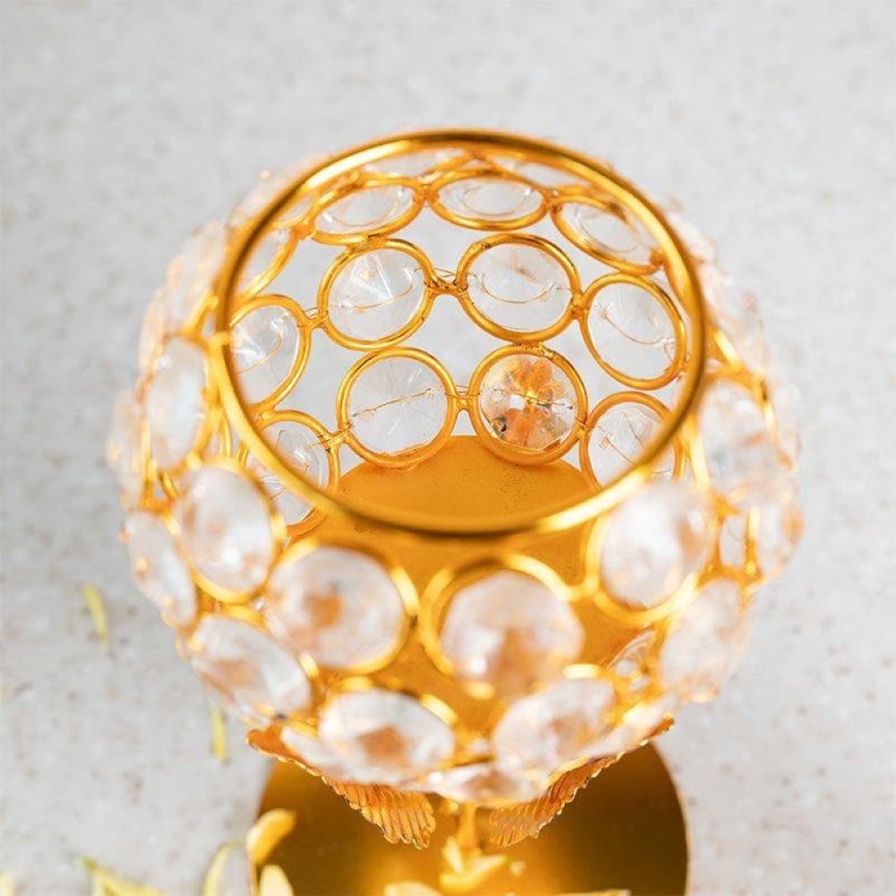 Elegant golden metal and crystal flower design tealight candle holder set. Perfect for home décor, festive decoration, Diwali, weddings, and gifting.