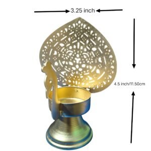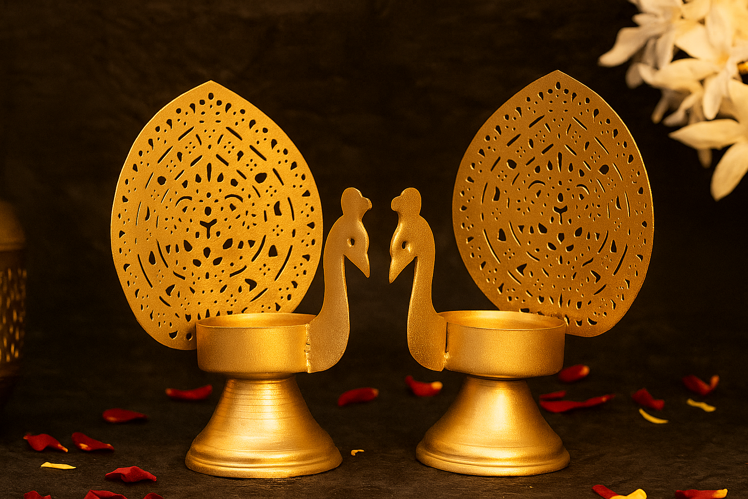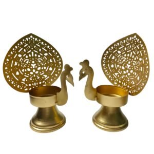 Add royal charm to your home décor with this beautifully crafted Golden Peacock Design Metal Diya Tealight Holder Set of 2. Designed with intricate peacock detailing and floral patterns, these diya holders reflect traditional Indian artistry with a modern golden finish.